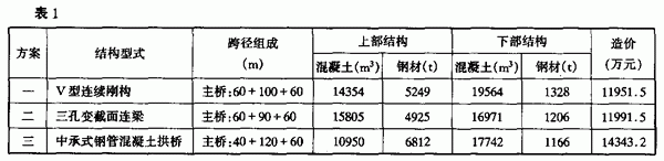方案1:V型连续剧构是近年来新发展起来的结构型式,桥型新颖美观,V撑减小主跨 跨径,断面尺寸减小,显得更加轻巧,结构整体性好,施工方便,造价较低。