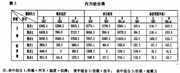 主桥基础力承台下接群桩基础,按m法计算。运营阶段计算了最大冲刷线时基桩内力、地震荷载,计算了一般冲刷线及液化线时的基桩内力。考虑了上部结构温度力,徐变影响力、上部预应力及基础沉降对下部结构的影响,按最不利组合进行强度验算。其结构不利组合见表3