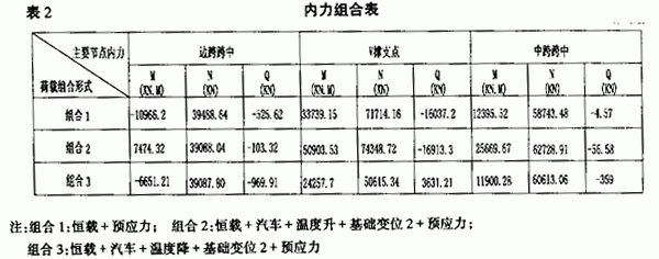 本结构为V型连续剧构,在施工阶段受力体系经三次交换,由低次超静定向高次超静定过渡,计算中纵、横向均采用平面杯系假定,利用桥梁综合程度分别对各施工阶段及运营阶段的受力情况进行了应力、应变分析。根据受力结果,合理调整支架的安装与拆除、混凝土浇筑及钢束分批张拉顺序,将各阶段的截面受力严格控制在安全范围之内。计算中考虑的荷载有:恒载、预应力、汽车荷载、挂车荷就温度变化影响力、基础变位影响力、混凝土收缩与徐变影响力等。由于篇幅限制,表2仅列出运营阶段控制设计的主要组合内力。