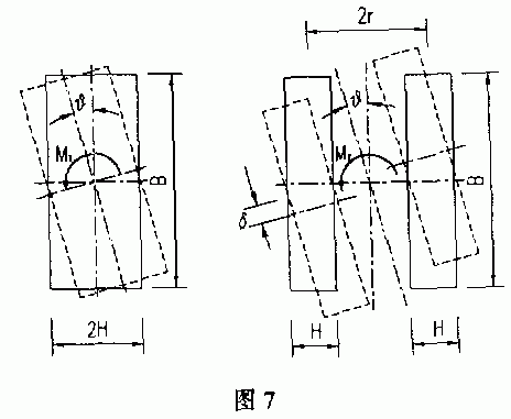 设单柱式墩的截面尺寸为BX2H,双柱式墩为BXH,中心距2r,墩高相同,如图7所示。在其他条件相同的前提下,经计算,边主墩若采用单位式墩,与采用双柱式墩相比较: