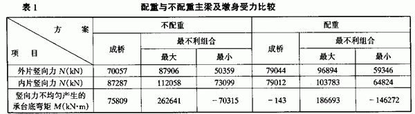 本桥的设计措施是在边跨合龙前在外侧悬臂端施加 90t的永久配重,其与不配重计算结果比较见表1。