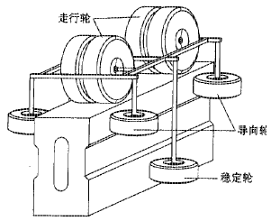 在轨道梁上行驶的城市单轨车辆转向架上装有三种轮胎:走行轮、导向轮和稳定轮(如图2所示),它的走行机理与钢轮-钢轨系统完全不同。在列车运行过程中,走行轮始终与轨道梁顶面接触,轮胎的弹性主要缓冲车辆竖向振动;导向轮和稳定轮则起到缓冲车辆横向振动的作用。如果转向架在平衡位置没有位移,导向轮和稳定轮将以有效半径向前滚动;当转向架发生横向位移(横移、侧滚、摇头)时,导向轮和稳定轮随之产生偏移,这时单侧或双侧的水平轮胎会受到轨道梁侧面的径向压力,这种压力将迫使转向架回到平衡位置。