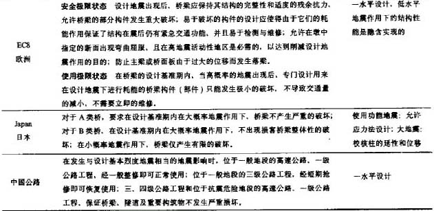 结构抗震设计的基本思想和设计准则是制定规范的最重要之处,它决定了抗震设计要达到的目标、采用的设计地震动水平和地震反应的计算方法。因此这里首先介绍世界几本主要的桥梁抗震设计规范的基本设计思想.见表1。