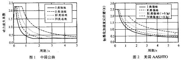 各国桥梁抗震设计规范的弹性设计谱曲线示于图1—图6中。可以看出,从反应谱坐标随周期的变化关系看,各规范的走势是相同的, 即随周期由小变大(或不变)至一个平台(最大值),然后逐渐衰减至与最大可用周期的一个定值。这个一致性是由地震反应谱的定义和地震动的特性决定的。