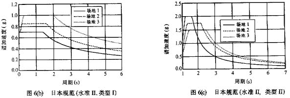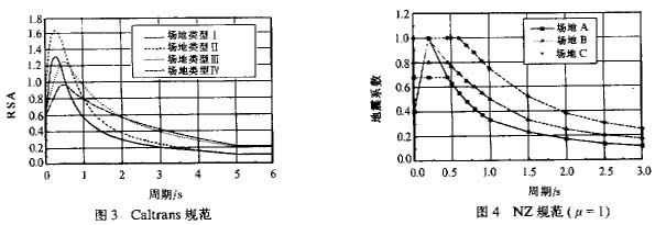可以看到,尽管各国规范关于场地划分类别的数目和具体方法不同,但所依据的主要物理参数都是场地剪切波速(或场地特征周期)和地表覆盖层厚度。关于场地条件对设计反应谱的影响还有几点需要说明:(1)ATC—32建议六类场地;(2)CaItrans和ATC—32先得到基岩加速度,然后进行土层分析得到设计地震谱。