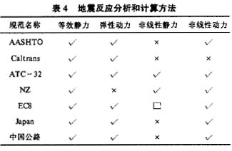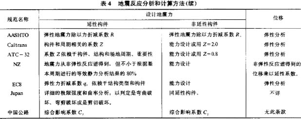 各国桥梁抗震设计规范采用的地震反应分析方法列于表4。可以看到,目前规范计算地震反应的方法有四种,即等效静力法、线性动力法、非线性静力法和非线性动力法。其中等效静力法和弹性动力法是目前规范中广泛应用的方法。非弹性静力分析方法主要是用来确定结构的倒塌机制和能力。ATC—32和Caltrans于1999年出版的桥梁抗震设计准则中引入这一方法,将来可能有更多的规范引入这一方法。各国规范对非弹性动力法用于桥梁抗震设计一股只有定性的指导性条款,而没有实施细则。这一方面是由于非弹性问题过于复杂,另一方面工程师在掌握这一方法方面还需要一定的准备和培训时间,在我国的桥梁设计部门、越来越多的研究生加入设计队伍、使用复杂分析方法的问题会逐步得到解决。