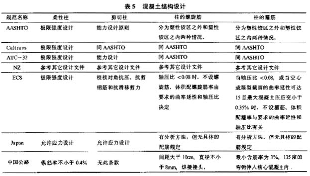 国内外的公路桥梁绝大多数是钢筋混凝土结构,各国桥梁抗震设计规范也主要是针对这种桥梁结构编写的。表5列出了各国规范在钢筋混凝土构件设计方面的方法: