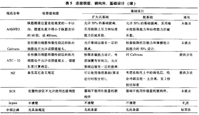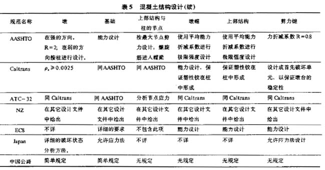 可以看到.美、欧、新西兰规范对很多设计的细节问题都给出具体的设计方法和要求,日本规范虽未给出配筋等具体设计细节,但给出了详细的混凝土构件允许和极限能力的分析方法,此法可以考虑混凝土、主筋及箍筋等的作用。相比之下,我国现行的《公路工程抗震设计规范》在这方面十分不足,亟待补充和改进。