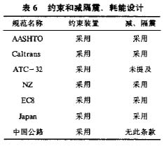 约束装置的设计和使用已经写入各国的桥梁抗震设计规范,我国现行的《公路工程抗震设计规范》也有这方面的条款,见表6。减、隔震和耗能技术则是在近几年才开始进入桥梁结构抗震设计规范的。美、日、欧、新西兰规范中部有详略不同的条文规定.我国现行的《公路工程抗震设计规范》没有这方面的条款,是需要补充的一个方面。减、隔震和耗能技术虽然已经有几十年的研究历史,但其应用还处于起步阶段,相应的技术法规还不完善。以往这一技术在桥梁上的应用实例尚不多。日本在阪神地震后,在桥梁修复、加加固中应用较多,但实际效果如何还有待考验。