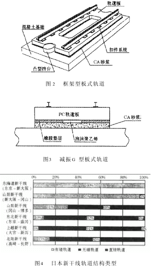 日本从60年代中期开始板式无碴轨道的研究到目前大规模的推广应用,走过近40年的历程。从津田沼、日野土木试验所内的实尺模型试验到既有线、新干线桥梁、隧道和路基上的各种型式无碴轨道结构的试铺,共建立了20多处近30km的试验段,开展了大量的室内、运营线上动力测试和运营观测工作,并在试验结果的基础上,不断地改进完善结构设计参数和技术条件,最终将普通A型(图1)、框架型(图2)、特殊减振区段用的减振G型(图3)及适用于土质路基上的RA型等板式轨道结构作为标准定型。板式轨道累计铺设里程已达2700km,并从山阳新干线冈山—博多段开始,广泛应用于东北、上越、北陆和九州等新干线全部的桥、隧结构及基础坚实的部分土质路基区段上(如图4)。其中,土质路基上的RA型板式轨道在试铺60m进行各项性能试验后,最终于1993年在北陆新干线(高崎—长野)正式铺设约11km。