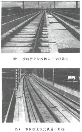 借鉴国外高速铁路无碴轨道结构的成功实践,我国提出了适用于高速铁路桥、隧结构上的三种无碴轨道结构型式(长枕埋入式、弹性支承块式和板式)及其设计参数[1]。1998完成对三种结构型式无碴轨道室内实尺模型的铺设及各项性能试验,提出高架桥上无碴轨道的施工方案和徐变上拱限值与控制措施,建立桥上无碴轨道车线桥耦合模型并进行仿真计算,初步分析高速铁路高架桥上无碴轨道的动力特性与车辆走行性能[2]。1999年选定三座高架桥作为无碴轨道的试铺段,在长度692m的沙河特大桥试铺长枕埋入式无碴轨道(如图7),长度741m的狗河特大桥(直线)和长度740m双何特大桥(曲线)上试铺板式轨道(如图8),与此同时,完成桥上无碴轨道设计[3]、施工技术条件[4]的研究与编制。为掌握桥上无碴轨道在高速运行条件下的结构受力、变形情况与振动特性,评估两种无碴轨道结构的动力性能,2000年对三座桥上无碴轨道与两座桥上有碴轨道进行了各项性能的对比测试[5]。为完善高速铁路无碴轨道的结构设计、施工工艺和设备,选定渝怀线鱼嘴2号隧道和赣龙线枫树排隧道分别作为长枕埋入式和板式轨道的试铺段,并分别于2003年6月和2003年底完成铺设。在线路开通后将对隧道内铺设的无碴轨道结构进行动力测试与长期观测。