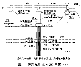 (2)由于子堤部位土方加高,一方面增加部分的土体自重引起17~18号桥墩间原有地面土体承重加大,土体密度增大;另一方面新增土体又经过推土机、压路机反复碾压,同时在整个大堤加固过程中,大量的重载汽车从桥下经过对桥下的土体也进行了碾压挤密。再者加上该桥墩处土质为淤泥质砂黏土(灰色、流塑、局部夹少量粉细砂),侧向膨胀系数大,又从来未经过碾压夯实,土体密实度低。经过上述反复碾压,土体密度大大增加并不断向侧向膨胀,带动17、16号桥墩处路基土体向大堤两侧移动。另外,主堤位置由于原有土柱较高,土体自重大,加之原有主堤上通行汽车,土体密实度大,主堤部位受新修子堤部位土体膨胀的影响较小,因而起到后背作用使得16、17号桥墩下路基土体向大堤外侧位移量增大,致使桥墩出现了明显向15号