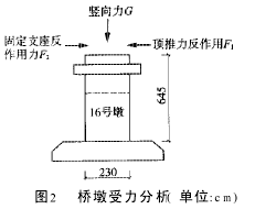 桥梁架设主要有吊装法架设、拖拉法架设、顶推法架设。此次梁体纵移复位施工,因梁体纵移量小,仅有60mm,因而采用顶推法进行纵移复位为宜。因梁体前后均为梁跨,无法重新制作后背,初步确定以16号桥墩作为后背。下面对该桥墩在顶推过程中的受力进行分析,如图2所示。
