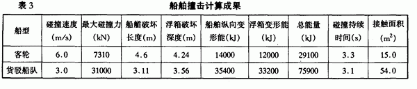 按以上客货轮代表船型和碰撞速度,及可能的最不利的撞击角度(45o),模拟撞击计算结果如表⒊。
