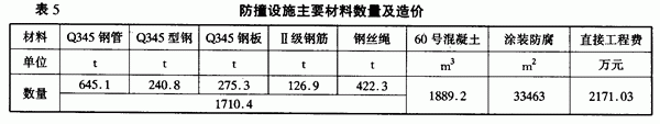 本防船舶碰撞装置规模十分庞大:顺河向长 155m,顺桥向 2 X 42. 5m,浮箱长 2 X 229m。除影响桥区景观,压缩航道宽度外,工程数量十分巨大,直接工程费2171.03万元,占桥梁主体直接造价( 8795. 09万元)的 1/4或总造价的 1/5如表5。