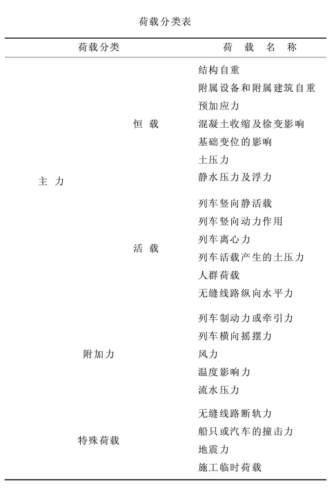 2.2.2计算荷载 ①结构自重:混凝土容重按25kN/m3计。 ②列车荷载:按列车的最大轴重、轴距及近、远期中最长的列车编组确定。 ③列车竖向动力系数:1+μ=1+0.8×12/(30+L) ④列车制动力和牵引力:按列车竖向静活载的15%计算,计算中区间双线计一线。 ⑤无缝线路的伸缩力、挠曲力、断轨力计算中,轨道纵向阻力按10.0kN/m~12.0kN/m/轨计算。 ⑥离心力:静活载乘以离心力率C,C=V2/127R ⑦列车横向摇摆力:按列车相邻两节车四个轴重的15%计算。 ⑧风荷载:基本风压按1200Pa计。 ⑨混凝土收缩、徐变:预应力加载时龄期按60d计算至1500d。 ⑩温度影响:广州地区合拢温度一般按20℃考虑,最冷月平均温度按13℃计,最热月平均温度按28℃计,桥面升温按5℃计。 ⑾基础变位影响:不均匀沉降按10mm考虑,更换支座按10mm考虑。 ⑿人群荷载:检修、人行通道上按4kN/m2计。 ⒀地震力:广州地区抗震设防烈度为7度。 ⒁桥上二期恒载:40kN/m每线(包括桥上防水层、轨枕板、线路设备、管线)。 ⒂施工荷载:根据工程实际进行计算(见荷载分类表)。