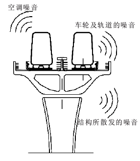 2.2.3内力组合2.2.3.1主力 ①自重+二期恒载+预加应力+活载+混凝土收缩及徐变 ②自重+二期恒载+预加应力+活载+混凝土收缩及徐变+基础变位 ③自重+二期恒载+预加应力+活载+混凝土收缩及徐变+无缝线路纵向水平力(伸缩力、挠曲力) ④自重+二期恒载+预加应力+活载+混凝土收缩及徐变+基础变位+无缝线路纵向水平力(伸缩力、挠曲力) ⑤自重+二期恒载+预加应力+活载(单列)+混凝土收缩及徐变+基础变位+无缝线路纵向水平力(伸缩力、挠曲力)2.2.3.2主+附 ①自重+二期恒载+预加应力+活载+混凝土收缩及徐变+基础变位+无缝线路纵向水平力(一线伸缩力、挠曲力)+制动力(另一线)+温度影响力+横向摇摆力 ②自重+二期恒载+预加应力+活载+混凝土收缩及徐变+基础变位+无缝线路纵向水平力(一线伸缩力、挠曲力)+制动力(另一线)+温度影响力+风力 ③自重+二期恒载+预加应力+活载(单列)+混凝土收缩及徐变+基础变位+无缝线路纵向水平力(一线伸缩力、挠曲力)+制动力(另一线)+温度影响力+横向摇摆力2.2.3.3主+特殊荷载 ①自重+二期恒载+预加应力+活载+混凝土收缩及徐变+基础变位+无缝线路纵向水平力(三轨伸缩力、挠曲力)+断轨力(一轨) ②自重+二期恒载+预加应力+活载+混凝土收缩及徐变+基础变位+地震力 根据以上内力组合找出最不利的工况,计算出该工况下结构的轴力、弯矩、剪力及扭矩,从而根据计算公式可反算出结构的配筋。2.2.4主要设计标准 ①《地铁设计规范》(GB50157-2003); ②《铁路桥涵设计基本规范》(TB10002.1-99); ③《铁路桥梁钢结构设计规范》(TB10002.2-99); ④《铁路桥涵钢筋混凝土和预应力混凝土结构设计规范》(TB10002.3-99); ⑤《铁路桥涵钢筋混凝土和砌体结构设计规范》(TB10002.4-99); ⑥《铁路工程抗震设计规范》(GBJ111-87); ⑦《铁路桥涵施工规范》(TB10203-2002 J162-2002)。3桥梁的防噪减震措施3.1噪音的产生 地铁列车经过高架桥时所产生的噪音主要有以下三部分组成(见图1)。