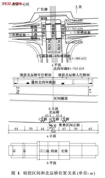 地铁矿山法暗挖下穿北辰桥和北四环路施工技术 [摘要]北京地铁奥运支线暗挖区间隧道下穿北四环路和北辰桥,北四环路在北京交通中起着至关重要的作用,车流量很大,控制施工沉降,保证桥体和北四环路安全稳定,保证车辆正常通行是施工控制的关键。暗挖区间隧道通过采用超前探测、增设临时仰拱、袖阀管、锁脚锚管等技术措施,安全、顺利完成了北四环路和北辰桥段的施工。 [关键词]隧道;暗挖;超前探测;袖阀管 1 工程概况 北京地铁奥运支线奥体中心站~奥林匹克公园站区间位于北中轴路下方,南北走向,区间结构顶埋深9.34~15.34m,双线间距17m。区间标准断面为马蹄形,复合式衬砌,短台阶矿山法暗挖施工,开挖宽度6.06m,高度6.43m,采用C20喷射混凝土+钢筋格栅进行初期支护。其中K1+663.029~K1+743.029段区间下穿北四环路和北辰桥2号桥(四环路中心里程为K1+703.029),总长80m。该段区间隧道主要穿越地层为粉质粘土、粉土和粘土,拱部在粉土和粉质粘土层,底板在粉质粘土和粘土层。 2 北辰桥状况及允许沉降情况 2.1 北四环路现状 四环主路机动车道为双向8车道,路面宽2×16m,辅路机动车道为两上两下,路面宽2×11m。中央隔离带为2m,主辅路之间分隔带为2m,辅路人行步道5.25m。北四环路是北京市交通的主要快速干道,车流十分密集。 2.2 北辰桥现状 北辰桥位于北中轴路与北四环路相交处,北中轴路设3座跨线桥上跨北四环路。其中1、3号桥设于北中轴路上,分别位于2号桥的西侧及东侧。1、2、3号桥均为跨越北四环路的四跨简支T形梁桥,梁长均为18m,桥梁全长均为72m,桥宽均为17.7m。 2.3 U形槽 北辰桥未设桩基础,墩柱直接设置在北四环路面下的U形槽结构上, U形槽结构分为7块。受地铁区间暗挖施工影响的3~5号块结构长43.5m,底板厚80cm,边墙厚70cm,全宽71.9m。每块之间均设2cm宽伸缩缝,内设止水带。 1号桥南北向上跨3号块,2号桥南北向上跨4号块,3号桥南北向上跨5号块。1、2、3号桥桥台用U形槽边墙代替,桥台两侧设耳墙。 2.4 暗挖区间与北辰桥及U形槽位置关系 区间暗挖隧道结构位于2号桥下方、U形槽4号底板下,且平行于2号桥,区间暗挖隧道结构顶距U形槽底板底距离为6.6~8.4m。具体关系如图1所示。U形槽基础结构如图2所示。