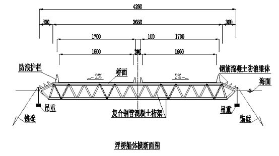 作浮桥的浮船有其特点,船舱空间无使用要求,可自由设置纵、横向加劲桁架。钢筋砼桥面板的长、宽度都大,适宜设置纵、横向加劲桁架来支承荷载和分散传至船体,减小船体变形。加劲桁架的弦杆与桥面板和船体相结合,形成复合钢管砼结构,成为双向的板桁结构,整体的刚度很大。浮船起囤船作用,加劲桁架起倒船舶龙骨作用。加劲桁架采用复合钢管砼,结构的整体刚度大,加工焊接简便,腹杆采用钢丝网水泥砂浆作长效防护。浮船受车辆和风浪的作用,总纵向弯曲和横向弯、扭变形较大,内力组合情况复杂。在纵向加劲桁架弦杆内加设预应力钢绞线束,形成预应力复合钢管砼桁架。整个船体成为预应力结构,纵、横向的抗弯、扭刚度加大,可保证稳定与和安全。