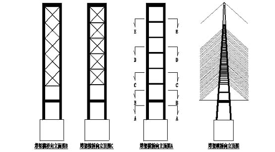很好,抗震性好,安全可靠。将钢管砼的钢管紧箍力作用作分离计算以后,复合钢管砼的计算已能采用组合叠加方法解决,实际是一种特殊形式的钢骨砼,利用劲性骨架作高塔的升模施工很方便。斜拉索和悬索平面布置呈外张形式,对桥面横向稳定有利。塔架顺桥方向的立面形式为复式“A”字形刚架,柱底部为分离矩形截面,柱中部为分离“凸” 形截面 ,柱顶部为箱形。采用在水平的复合钢管砼杆件内加预应力,以平衡两边斜拉索的水平分力。刚架的复合钢管砼水平横撑仅设中部,以便斜拉索张拉锚固。塔架横桥方向立面的形式为矩形刚架或桁架,横向连接都设在柱两侧,能满足横向抗风稳当需要,采用复合钢管砼和钢管砼骨架施工都较方便。