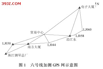 由于海珠广场、东湖、燕塘等站附近无GPS控制点和高级附合方向,个别区段导线附合长度较长约5km左右。因此用GPS测量手段将LJ044、贸易中心(二号线GPS点)、LJ058、LJ060、LJ082、LJ084等点加密,按C级GPS网观测要求施测,以增加导线网的附合方向、缩短导线附合长度提高导线网的精度,GPS网形示意图见图1。