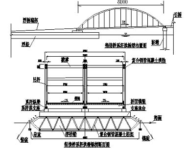 作浮桥的浮船有其特点,船舱空间无使用要求,可自由设置纵、横向加劲桁架。钢筋砼桥面板的长、宽度都大,适宜设置纵、横向加劲桁架来支承荷载和分散传至船体,减小船体变形。加劲桁架的弦杆与桥面板和船体相结合,形成复合钢管砼结构,成为双向的板桁结构,整体的刚度很大。浮船起囤船作用,加劲桁架起倒船舶龙骨作用。加劲桁架采用复合钢管砼,结构的整体刚度大,加工焊接简便,腹杆采用钢丝网水泥砂浆作长效防护。浮船受车辆和风浪的作用,总纵向弯曲和横向弯、扭变形较大,内力组合情况复杂。在纵向加劲桁架弦杆内加设预应力钢绞线束,形成预应力复合钢管砼桁架。整个船体成为预应力结构,纵、横向的抗弯、扭刚度加大,可保证稳定与和安全。