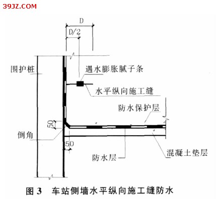 水平纵向施工缝中间设置一道遇水膨胀腻子条,先对接缝处混凝土基面凿毛处理、冲洗干净,并对预留凹槽进行修整、抹平、压实。遇水膨胀腻子条在混凝土浇筑前4 h内安装,以防止提前遇水膨胀;腻子条安装时做到压紧、封闭,不得重叠。水平纵向施工缝与环向施工缝相交部位的防水材料应相互搭接,以形成闭合体系。车站水平纵向施工缝处防水详见图3。
