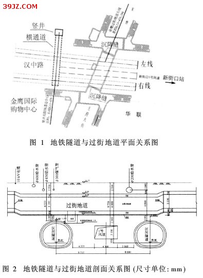 地铁暗挖隧道下穿过街地道施工技术 摘 要 南京地铁2号线上新区间的隧道下穿带有围护桩的金鹰过街地道。穿越段的地质条件差、富含地下水、管线密集,施工难度较大。采用长管棚支护和全断面劈裂注浆形成有效的超前支护,结合洞内跟踪注浆及桩基托换等辅助措施,改善了土体自稳性能,控制了土体的水土流失,并减小了隧道开挖引起的地层沉降,使隧道顺利下穿过街地道。 关键词 地铁;土质隧道;超前支护;管棚支护;小导管预注浆 1 工程概况 1. 1 设计概况 南京地铁2号线上海路站———新街口站区间隧道为2座分离式单线隧道。区间隧道竖井的横通道里程为K13+438,并沿汉中路向东与新街口车站1号风道相接。在横通道以东正线隧道和新街口站1号风道共3条隧道小间距平行布置。正线隧道为马蹄形断面。左右正线隧道中间的新街口站1号风道暗挖段为矩形断面。3条隧道均从金鹰过街地道下穿过。相交段地铁长约13. 5 m,交角72°。区间隧道结构与金鹰过街地道底板净距约1. 2 m。其中左线区间隧道初期支护与金鹰过街地道外挂下沉式水泵房底板局部有位置冲突。隧道与金鹰过街地道相互关系见图1和图2。