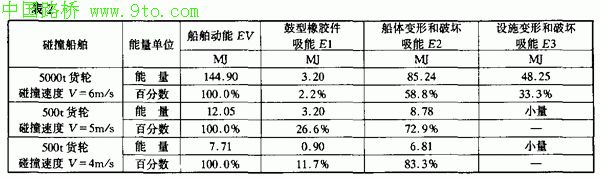 橡胶防撞物虽有变形吸能的作用,但具有较高速度的大吨位船舶带有极大的功能,对于此类碰撞橡胶防撞物所起作用甚小,绝大多数的船舶动能都是由船舶及防控设施的变形与破坏吸收,表2是一些计算结果。