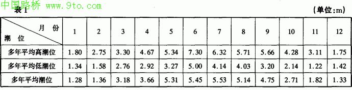 南京河段距入海口约450km,位于长江下游感潮区内,非正规半日潮型,流量以雨水经流为主,同时受潮汐影响,每年5~10月为洪汛期,11月至次年单月为枯水期,洪峰出现在6~8月份。根据南京下关水文站统计多年水位资料推算本桥桥址潮位特征如表1。