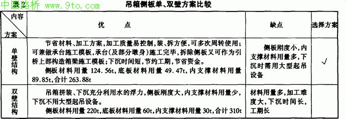 由表2可以看出,侧板单壁节省材料,加工方便,质量容易控制,节省模板资金,下沉时间短,尽管需用大型起吊设备,但时间较短(两个吊箱共需5~7d时间),综合考虑,优点优于双壁结构,故侧板选用单壁结构。