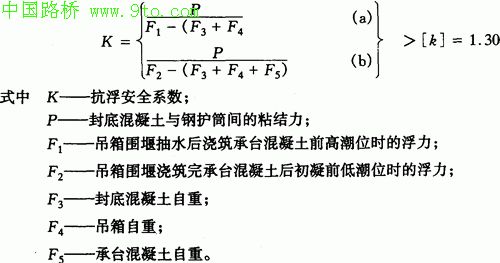 ⑧抗浮计算分两个阶段:一个阶段是吊箱内抽完水后浇筑承台混凝土前,另一个阶段是浇筑完承台混凝土后承台混凝土初凝前;分别计算封底混凝土与钢护筒间粘结力及吊箱围堰的上浮力,使其满足下式要求: