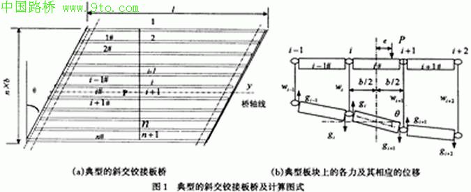 对于图1(a)所示由若干片板梁放在一起,其间用纵向镇键问D顺桥轴线向的饺)连接而成的斜交饺接板桥结构,假定:
