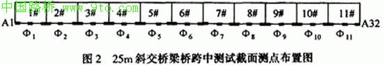 为了验证所提出方法的适用性及精度,本文结合浙江平湖的乍浦大桥25m跨径、斜交角为28度、单梁宽为1.5米的高效预应力混凝土空心板梁桥的设计,进行了分析和试验研究。该桥梁桥的单孔桥跨测试截面测点布置见图2,设计荷载为汽一20级、挂一100,混凝土设计标号为40号,预应力材料采用