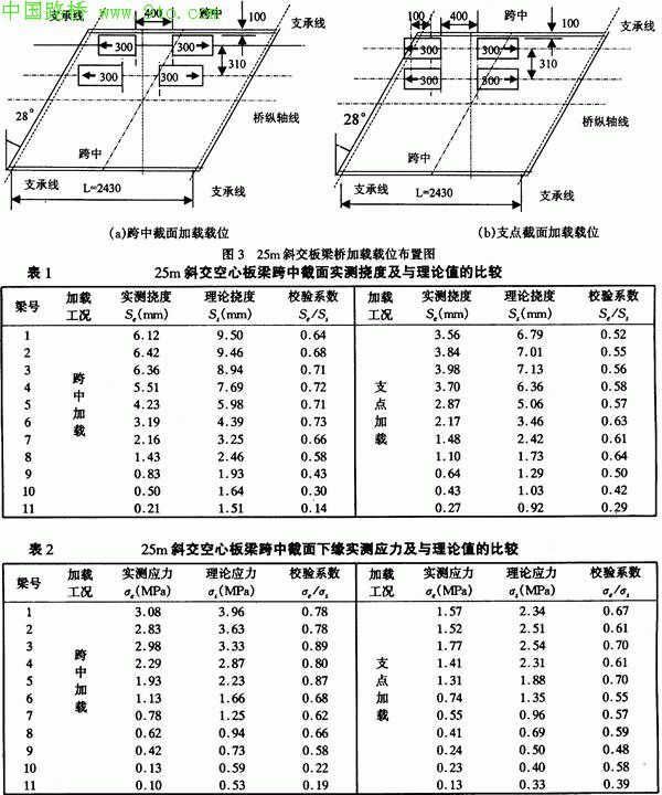 各个工况下,25m斜交空心板梁桥各板梁跨中的挠度和应力的实测值及与按斜交铰接板桥理论计算值的比较见表1、表2。