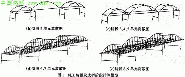 深圳市芙蓉大桥是一座三跨连续钢管拱系杆拱桥,跨径为 L= 55m+ 80m+ 55m,桥梁宽度为23.5米,已于2000年3月建成通车。该桥采用钢管混凝土拱肋与桥墩固结,桥面结构采用纵向漂浮体系,由两根T形纵梁及箱形横梁组成,系杆为钢绞线束,拱肋为哑铃形,钢管直径为70cm,拱肋间边孔设两根根撑,中孔设三根横撑,桥面对拱肋的约束作用相对较弱。在设计及施工过程中,如何考虑桥面及吊杆对拱肋的作用,施工过程中结构的体系转换对拱肋空间稳定性的影响等是工程师们关注的重要问题。该桥用文献【1】提供的近似方法进行计算,得出的拱肋稳定临界荷载偏小【1】,而国外一般的几何非线性分析软件仅能将各施工阶段作为独立的结构采用特征值法进行计算,不能考虑各阶段之间内力的传递与初始力影响。为此,本文基于有限变形理论,考虑结构几何非线性,建立了一套能够模拟施工及成桥阶段受力的钢管拱系杆拱桥弹性内力及空间稳定性分析方法和仿真程序,采用初始内力法考虑阶段问体系转换及弹性内力的传递,逐步加载进行各施工阶段空间稳定性分析。模拟实际桥梁施工阶段,计算分析了该桥各阶段的稳定安全系数先稳特性;探讨了成桥体系拱肋的稳定安全系数及其影响因素,为该桥的设计及施工提供了依据。