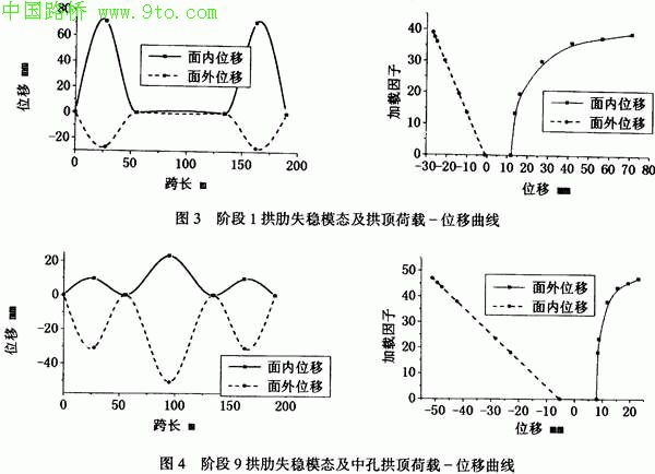 结构失稳为空间失稳,其面内、面外均有位移。为了判别拱肋的失稳模态,将根据拱肋变形及拱顶荷载一位移曲线的关系区分拱肋是面内失稳和面外失稳。若拱顶的面内变形与荷载呈非线性,面外为线性,则判定为面内失稳,反之为面外失稳。图3为阶段1在自重及水平风力作用下的失稳模态及拱顶荷载位移曲线,图4为阶段9成桥状态在使用荷载作用下的失稳模态及拱顶荷载位移曲线,由此可以得出在这两个施工阶段均为面外失稳,阶段9计算结果还表明,结构失稳为边孔及中孔拱肋均达到失稳状态。表1给出了各阶段的失稳特征。