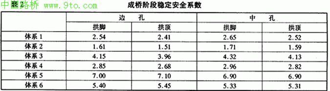 表2给出了上述各体系的稳定安全系数计算结果,根据桥面结构的实际情况,对纵梁进行有效的横向约束,成桥工作状态介于体系3与体系5之间,稳定安全系数为3.96~6.90,基本满足规范要求;若取消拱肋间的横撑,则成桥工作状态介于体系4与体系6之间,稳定安全系数2.68~5.31,不能满足规范要刹到,该桥拱肋间必须设置横撑;若不计吊杆"非保向力效应",拱肋的稳定安全系数仅有计吊杆"非保向力效应"的 28%~ 35%。由此可知吊杆作用、纵梁及桥面系刚度、拱肋间横撑对系杆拱桥稳定性及体系选择影响很大。