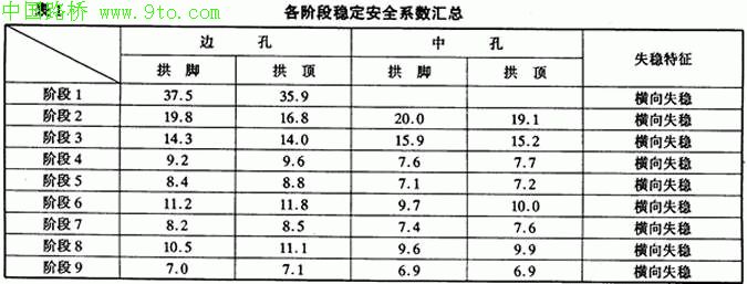 其中,Ncr为拱肋失稳轴力,N为该阶段对应的使用荷载作用下的轴力。这种表达方法仅考虑了拱肋失稳时拱肋临界轴力与使用荷载之比,能够明确表示出初始力的影响,但忽略了其他因素的相互作用,本文采用第二种方法定义拱肋的稳定安全系数。各阶段稳定安全系数如表1。