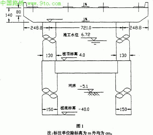 由于河流通航,首先否定了大围堰施工方案。后参考深水基础之高桩承台的钢吊箱施工方法,制定了有底钢吊箱方案,将两根桩柱和系梁同时套在一个吊箱内,先浇筑封底混凝土,再抽水施工系梁和接柱。本方案可行性大,但考虑到系梁仅7立方米混凝土,综合成本较大,故未采用。最终采用的方案为小吊箱方案,特制的圆形小吊箱仅将单根桩柱套住,而系梁是预制的,被固定在两个小吊箱之间,与小吊箱同时下沉至设计位置,然后按有底钢吊箱法施工接柱。该方法吊箱轻,成本低,方法简单易行,实际应用得到了成功。