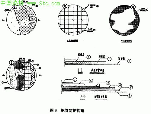 本桥钢管采用复合材料防护。厚度为1~3mm,防护构造由隔离、强度及耐候胶衣三层组成,如图3所示。