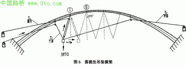 桥位处江水水位不稳定,大型浮吊无法作业,通常的天线吊装,价格达210万元(包括拱肋及桥道)。本桥桥道横梁用拱肋为支撑,采用"荡提法"吊装。所用设备及工艺均较简便。横梁重量38t左右。吊装布置如图6。