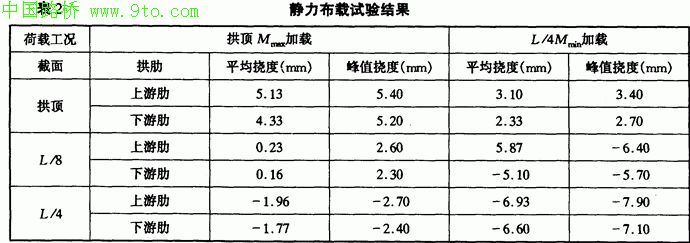 (4)对比上下游拱肋在各工况下的变形响应,小有出入,一般为5%~10%左右,且上下游拱肋或高或低并非一致,荷载愈大相差愈小。