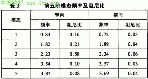 (1)结构竖向自振一阶频率为0.82,阻尼比为0.16;横向自振一阶频率为0.72,阻尼比为0.03,与一般同类桥梁相近,与结构体系的特点相符。