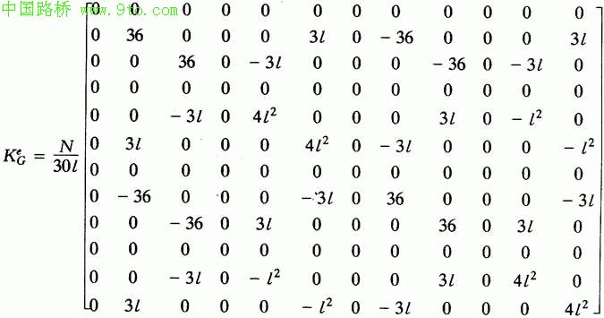以前的文献对空间梁单元几何刚度矩阵的推导方面论述较多,都建立在一些假定的基础上,这里就不详细说明。考虑到结构的整体切向刚度矩阵精确与否并不改变最终结果,仅影响迭代收敛的速度,并且不是越精确的整体切向刚度矩阵迭代收敛越快。所以,本文建议计算时的单元几何刚度矩阵来用以下最普遍的形式: