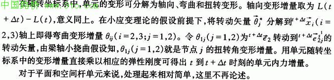 从随转坐标系中的三个自由度可以看出,它们反映的是单元的真实变形情况,与单元所经历的刚性位移无关。在用有限元方法求解非线性问题时,只要将单元尺寸划分得适当小,整体坐标系下的小应变大位移问题在单元随转坐标系中就转化为小应变小位移问题,这一点可从非线性连续介质力学给出证明。这样,随转坐标系下的受力变形情况就可近似地接线性处理,单元内力增量的计算也就与线性情况一样,这里不再赘述。同时也正说明了工程中常用拖动坐标法计算平面结构大变形问题的正确性。