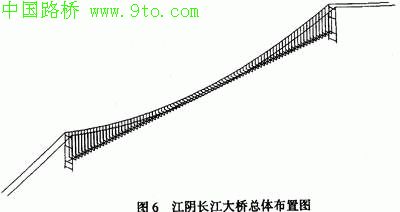 江阴长江大桥是我国目前建成的最大跨度悬索桥,见图6所示。主跨跨度为1385m。主梁为宽36.9m,高3.0m的扁平状闭口钢箱梁。主缆相距32.5米,吊杆间距为1.6m,矢跨比为 l/10.5。桥塔为门式框架结构,南北桥塔高分别为187m和184m。桥面波置为R=27710m的竖曲线。