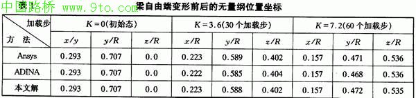 本例是ADINA中的45度弯梁大位移分析考题,梁的形状和截面尺寸见图5。该梁位于X一y平面内,梁根固定,在自由端沿Z方向受一个集中荷载的作用,梁因此发生空间弯扭大变形。分析时将梁划分为8个单元,每步加载量为10.0,有关参数见图5中所示。分别用ADINA,AnsyS和本文程序计算了60个加载步,各计算结果均基本上一致。梁自由端无量纲位置坐标在初始时刻,加载30步与加载60步时的比较列于表1,可见三者相互较吻合。为了进行对比,都没有考虑剪切影响。为简洁起见,这里不指定专门的量纲单位。