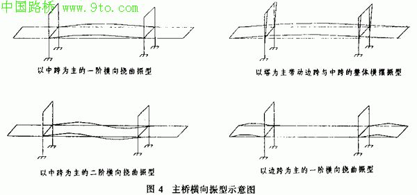 (3)由于中跨跨中处吊索最短,所以其横向刚度最大,使得在主桥中跨中桥面上的振动成分有传递到主缆的可能,分析表明;跨中主缆横向