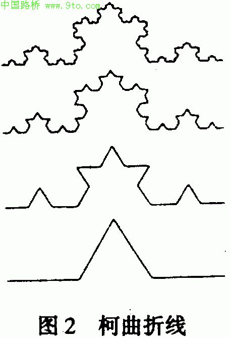 数学家按一定的规则构造出具有严格自相似性的规则分形集合。如康托尔三分集、谢尔宾斯基垫片、柯曲折线等。如图2为柯曲折线的结构,具有严格的自相似性。自然界中被认为是分形系统的海岸线、云层边缘、地球表面、断口表面以及液体湍流等,没有一个严格意义上的分形,其自相似性是近似的或统计意义上的相似,分形自然体在局部和整体的某种相似性通常只是在某些特定的尺度范围内才成立,这些尺度范围被称为"无标度区",这种只在无标度区内具有自相似性的分形也称随机分形。形态(结构)、信息、功能或时间上具有自相似性的客体称为广义分形[6]。